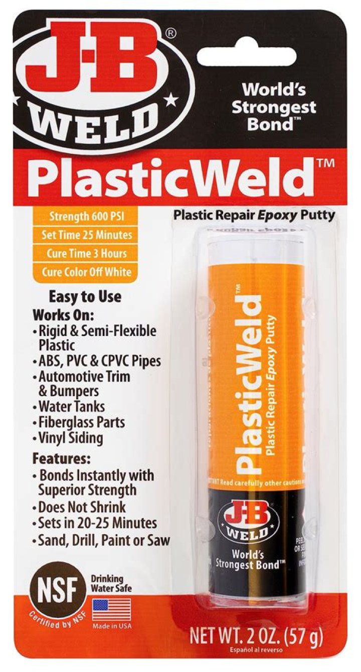 J-B Weld PlasticWeld is designed for DIY plastic repairs on ABS, PVC & CPVC pipes and plastics, auto bumpers and more! PlasticWeld is certified by the NSF and is safe for contact with potable water. … J-B Weld PlasticWeld set and cure color is off white.