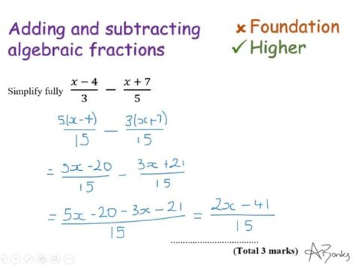 To add or subtract algebraic fractions: Find the lowest common multiple of the denominators. Express all fractions in terms of the lowest common denominator. Simplify the numerators to obtain the numerator of the answer.