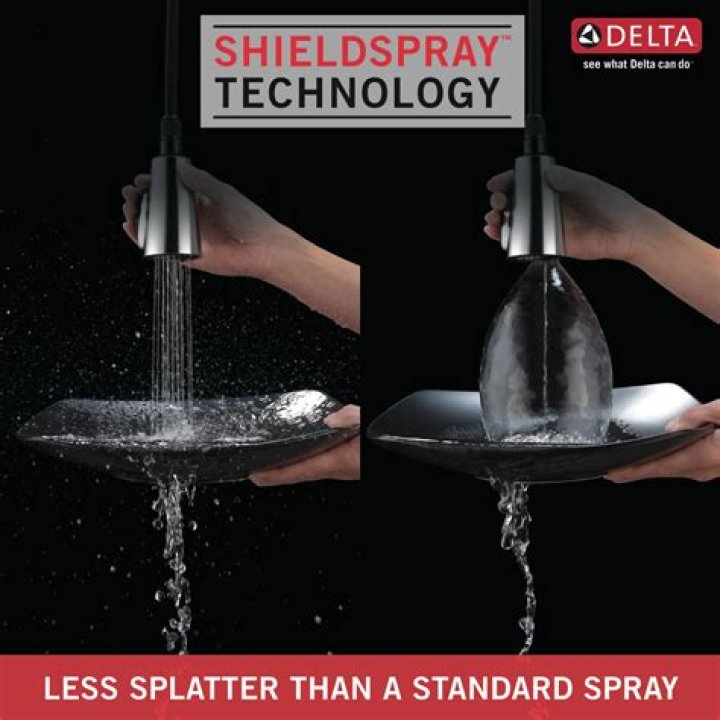 Delta ® ShieldSpray ® Technology cleans with laser-like precision while containing mess and splatter. A concentrated jet within a protective sphere of water powers away stubborn messes with an average of 90% less splatter than a standard spray, so you can spend less time soaking, scrubbing and shirt swapping.