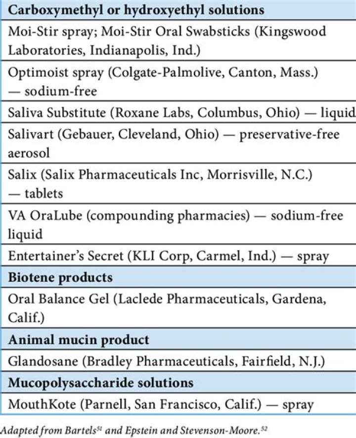 Try over-the-counter saliva substitutes that contain xylitol, such as Mouth Kote or Oasis Moisturizing Mouth Spray, or that contain carboxymethylcellulose (kahr-bok-see-meth-ul-SEL-u-lohs) or hydroxyethyl cellulose (hi-drok-see-ETH-ul SEL-u-lohs), such as Biotene OralBalance Moisturizing Gel.