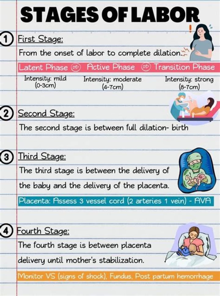 First stage: Dilation of the cervix (mouth of the uterus)Second stage: Delivery of the baby.Third stage: Afterbirth where you push out the placenta.Fourth stage: Recovery.