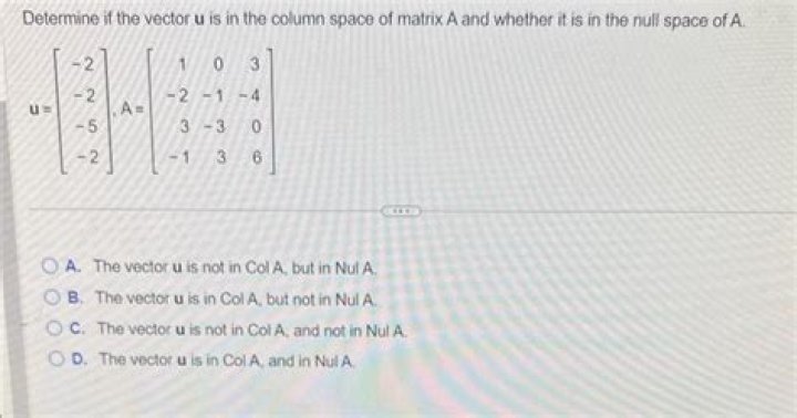 First off, in order for some vector V to be in the column space and null space of A, A must be square. Second, any A will have the zero vector in both its column space and null space. Third, compute A2 , and then convert it to row echelon form to find its null space.