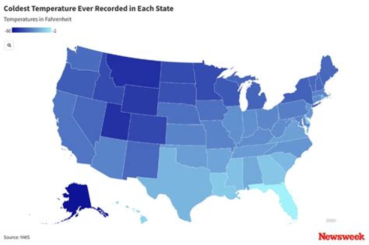 Alaska leads the United States with the coldest temperature ever recorded, at -80.