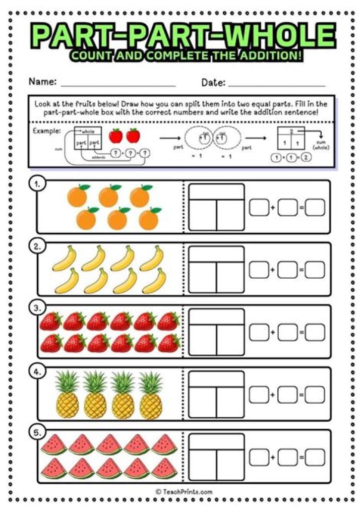 The act of splitting a number into component parts is known as partitioning. The part whole model is a useful model for students to learn and utilise as it will assist with addition and subtraction later on in their mathematical journey.
