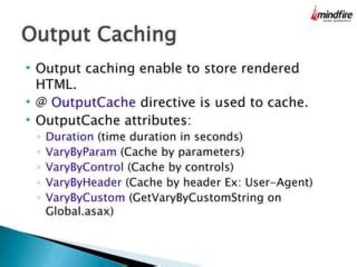 The output cache enables you to cache the content returned by a controller action. … Output caching basically allows you to store the output of a particular controller in the memory. Hence, any future request coming for the same action in that controller will be returned from the cached result.