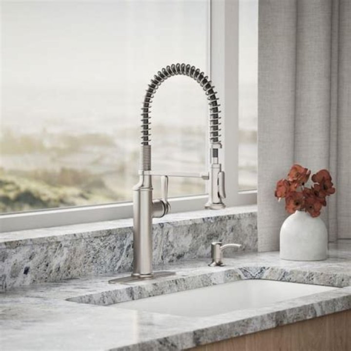 Inspired by the design of professional kitchens, the Sous pull out kitchen faucet will bring to life your inner chef. It includes assembled faucet, 29-1/2 in. supply lines, soap/lotion dispenser, and deck plate. Its high arch and unique exposed-spring design exceptional control and flexibility.