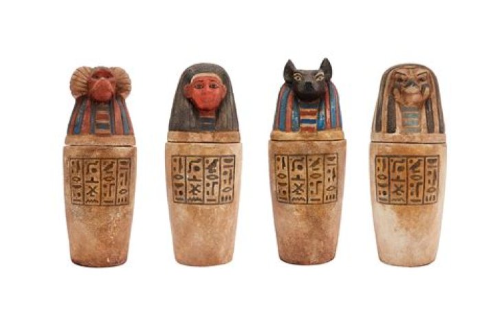 In the Old Kingdom the jars had plain lids, though by the First Intermediate Period jars with human heads (assumed to represent the dead) began to appear. Sometimes the covers of the jars were modeled after (or painted to resemble) the head of Anubis, the god of death and embalming.
