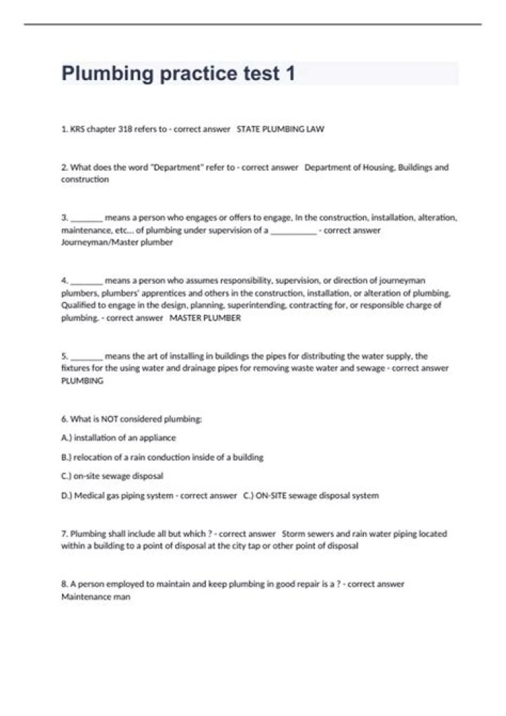 Basic plumbing practice test has questions and answers related to what you learn at plumbing trade school, technical college and during apprenticeship. To work as a plumber, you’ll need to take a certification exam.
