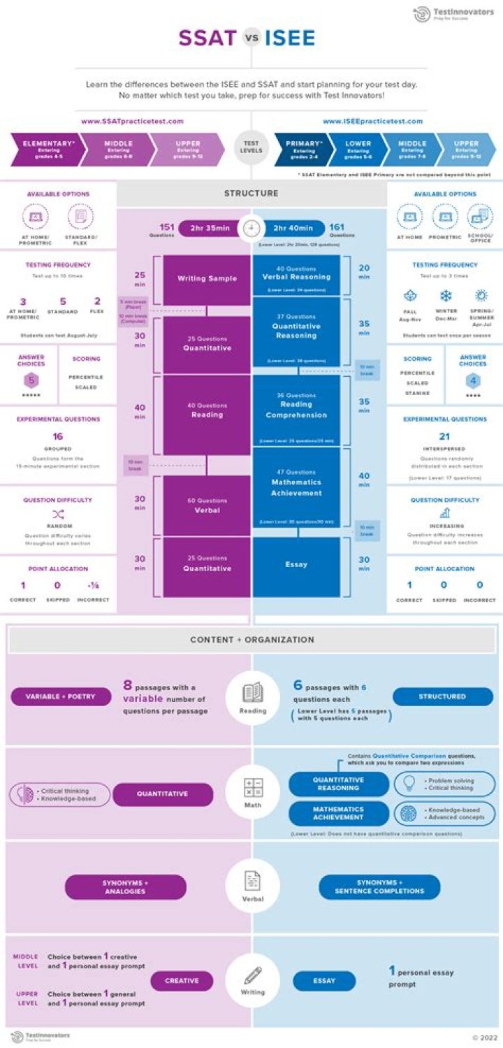 Reading section: The ISEE and SSAT reading passages cover a variety of subjects, with the primary difference being that SSAT includes poetry and older-style literature while the ISEE generally focuses on more contemporary passages. Math sections: The ISEE and SSAT both have two math sections.Is the SSAT test hard?